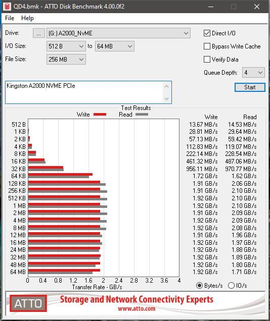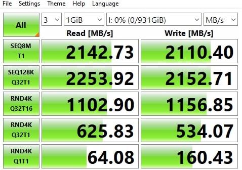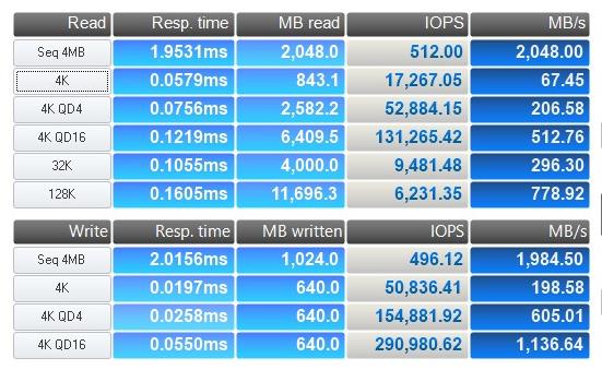 In Crystal Disk the drive showed sequential read results almost exactly to specification with the write results being a touch higher. Things were a little lower in Anvil with 2048MB/s and 1984MB/s but still impressive.