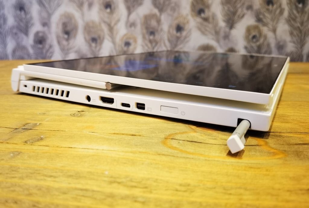 The display is obviously the stand out feature. You have your standard hinge to open the laptop but then a second “Ezel” hinge in the middle which smoothly adjusts in between the various other modes such as laptop, float, share, pad, stand and display