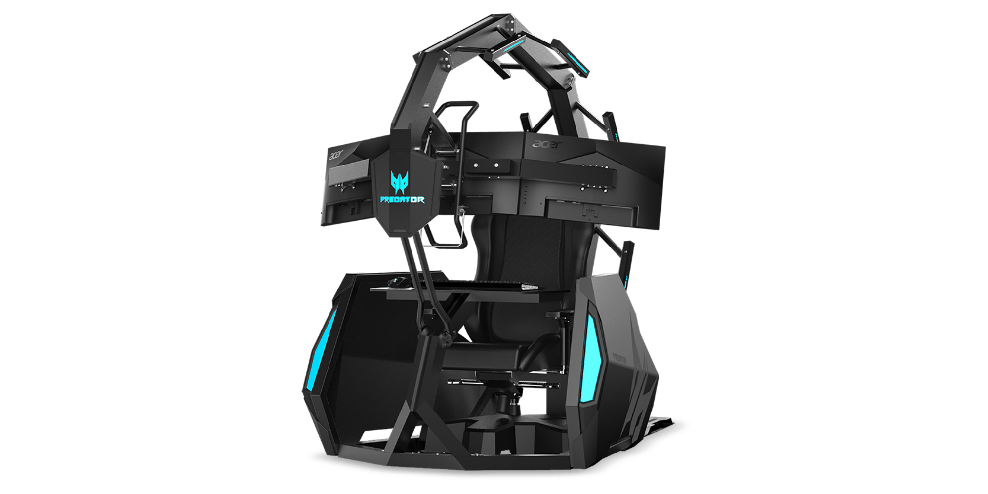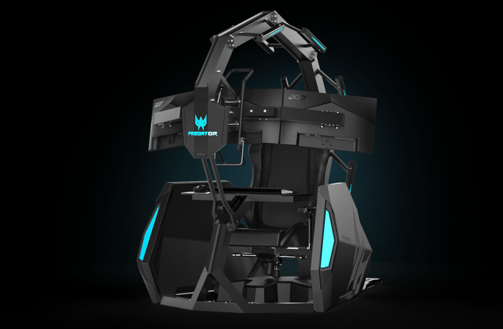 The Predator Thronos Air, Acer’s newest gaming “chair,” is a sleek gaming cave for hard core enthusiasts. The steel structure includes a chair, modular desk and monitor arm. It envelops the gamer in a comfortable and encasing cockpit, ideal for total and complete battle immersion. Teal blue lighting emits a soft cool glow, perfect for gaming.