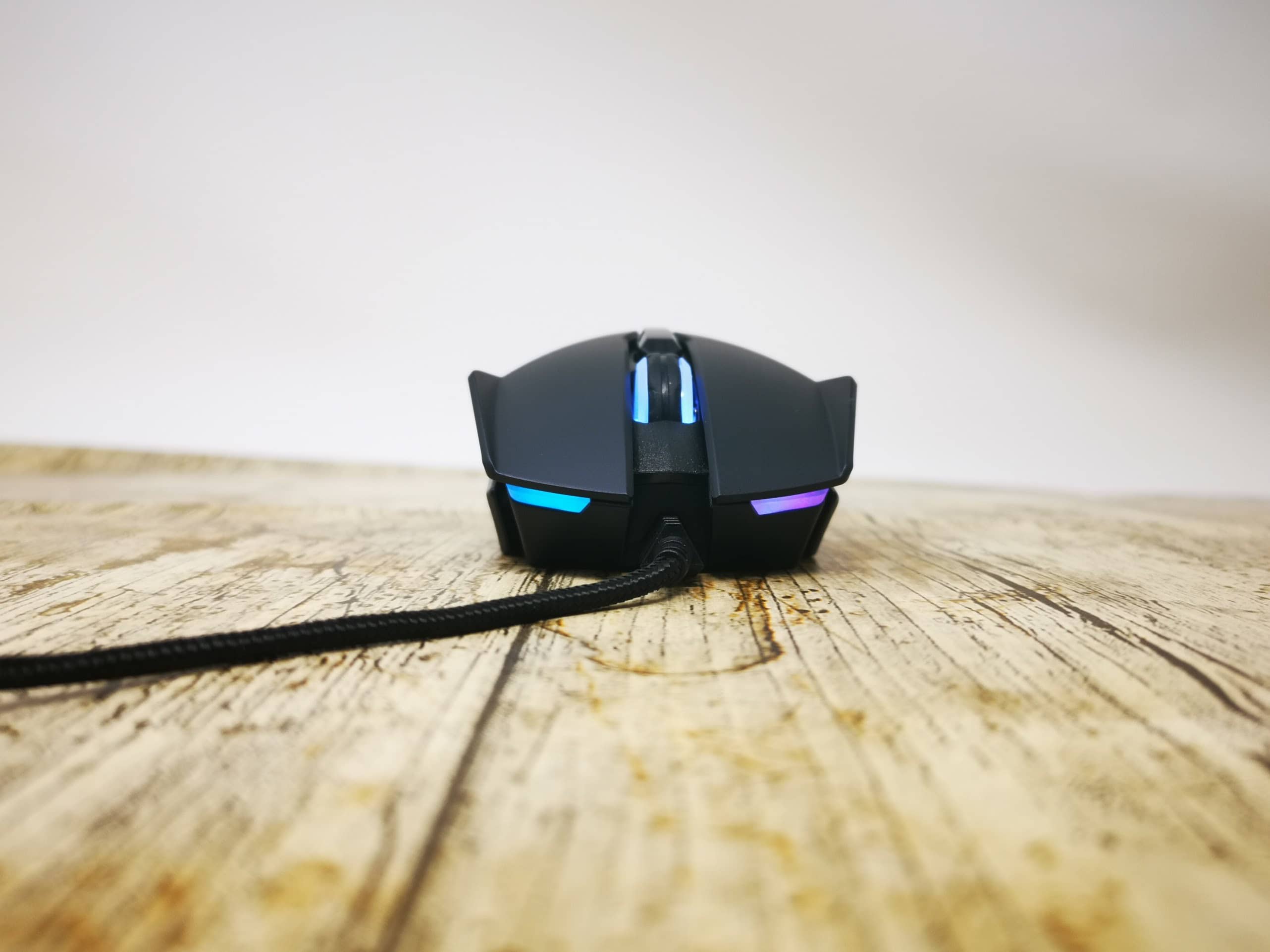 The Cestus 500 fits in with the Predator branding across the Acer range, and that is a very stereotypical PC gamer aesthetic. You have the aggressive looking logo on the rear of the mouse which is RGB, the mouse buttons flare up at the edges giving a sort of devil horn appearance, then the sides of the mouse feature more programmable RGB along with the mouse wheel.