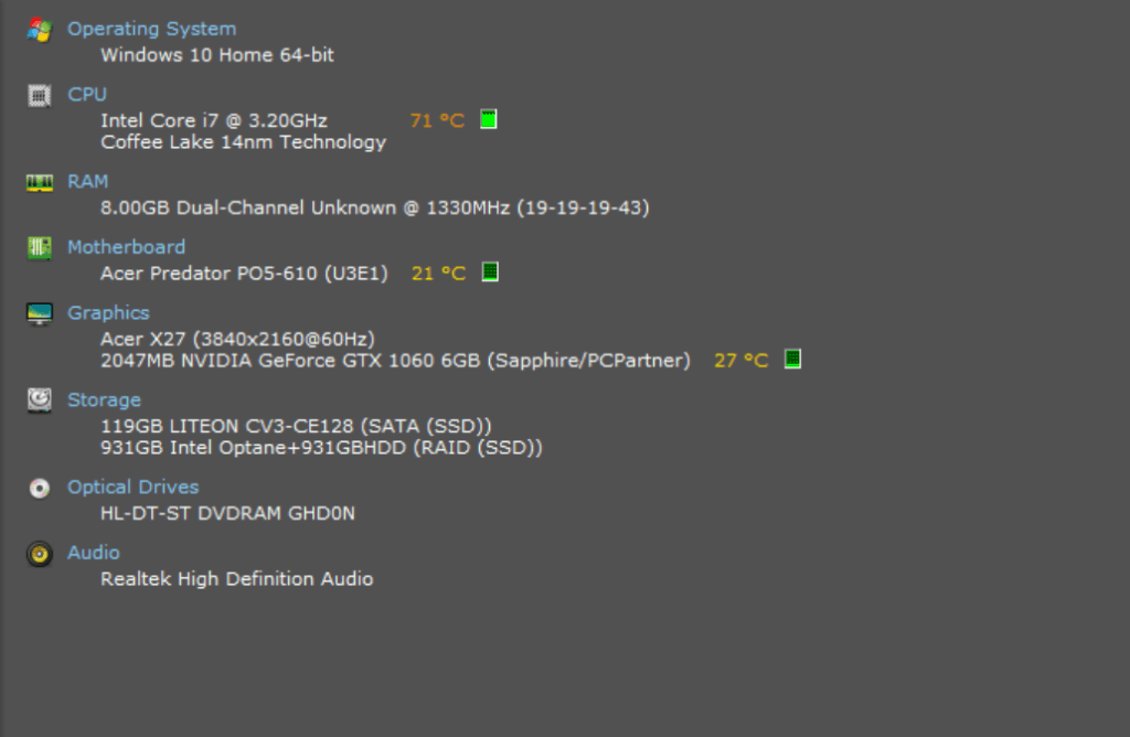 However, this is pretty noisy. Fans spin up immediately, and they are always audible regardless of where you place the PC. Under almost any load the noise levels increase considerably, it is not just the blower GPU that is the issue but the CPU fan. Looking at speccy under normal load showed the fan speed running at 1900RPM, in comparison my main PC runs its fans at 400RPM.