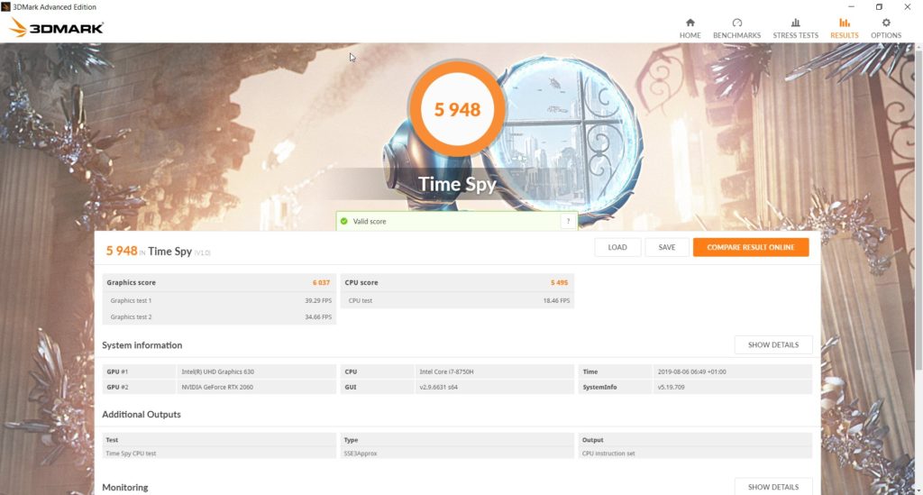 - Time Spy (GPU extreme & fans max): 5948(Graphics – 6037, CPU – 5495)