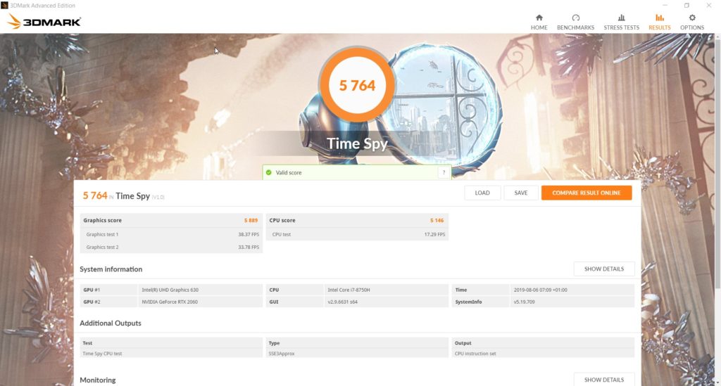 - Time Spy (normal): 5765 (Graphics – 5889 , CPU – 5146 );