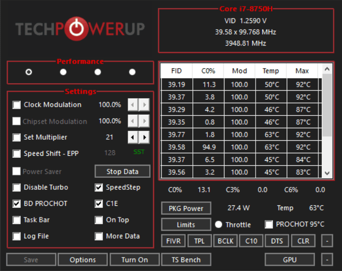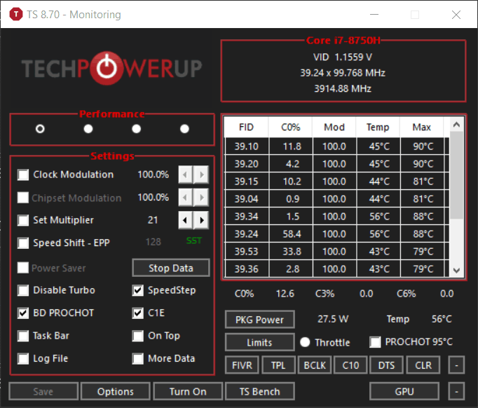 Experimenting with Throttlestop to try and reduce the thermals a little I set the underclock to -125mV, set the GPU to max, and turned the fan speeds up.