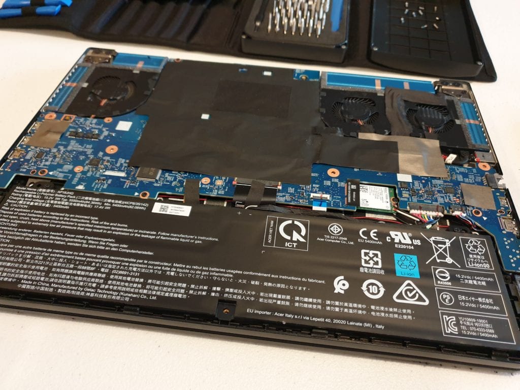 A quick look inside this laptop reveals it is a lot less friendly for upgrades, this will be due to the thinner chassis. For example, to gain access to the M2 slots you will also need to remove the battery and several other components. I wasn’t willing to do this on a review sample, but a Reddit user posted some pictures, and you basically have to remove the entire motherboard as it is upside down in the chassis.