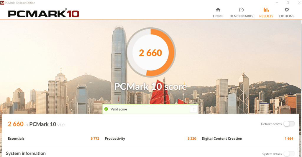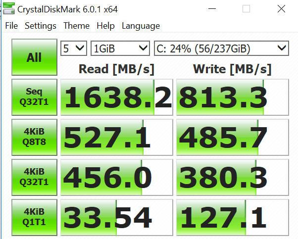 With PCMark 10 the laptop achieved an overall score of 2660 which is about the same score as you would expect and similar to other laptops using this CPU. The NVMe drive produced a 1638/813 MB/s read write score via CrystalDiskMark so it is not the fastest speed you would find from some Samsung based drives, but in real world usage you would never notice the difference and it is still blisteringly fast.