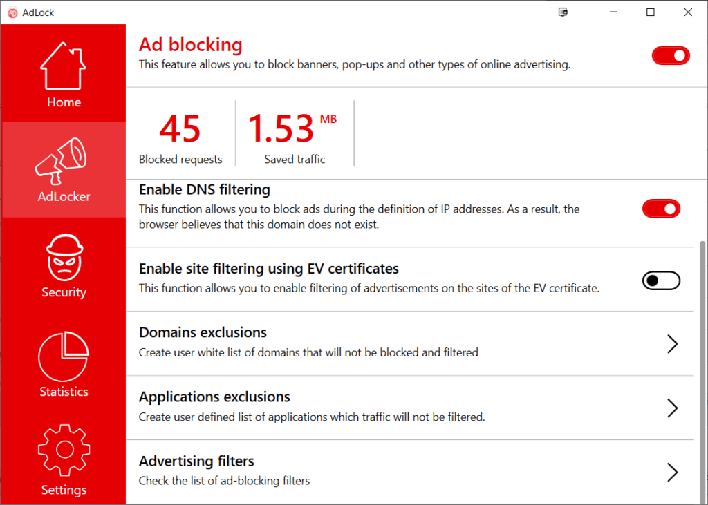 Unlike a browser extension this is a dedicated app, for both phones and desktops, it works by creating a local VPN to filter traffic and block requests for phishing and malicious websites. As it does not pass data to AdLock servers, it is both secure and fast. Functionality, this is similar to the popular PiHole solution, but it is considerably easier to implement as you do not need to set up an RPi on your network, install Linux or change any DNS settings.