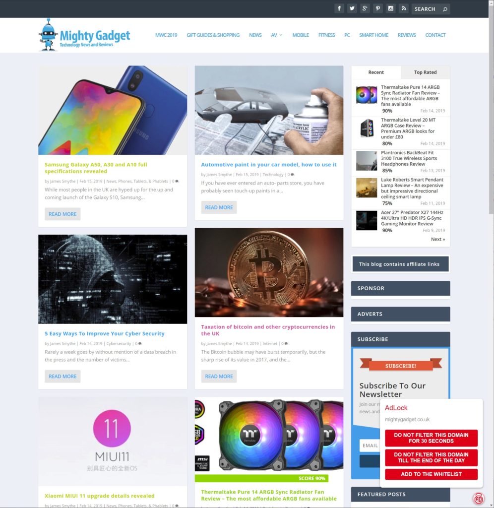 Switching my browser to incognito which disables my default ad-blocker allowed me to test this properly. On Mighty Gadget I do my best to keep adverts to a minimum, but I have to cover my costs and try and earn some money. With this on, no adverts were shown at all. In fact, it even blocked the sponsor listing in my sidebar which was just a static image and logo, most adblockers would not block that.