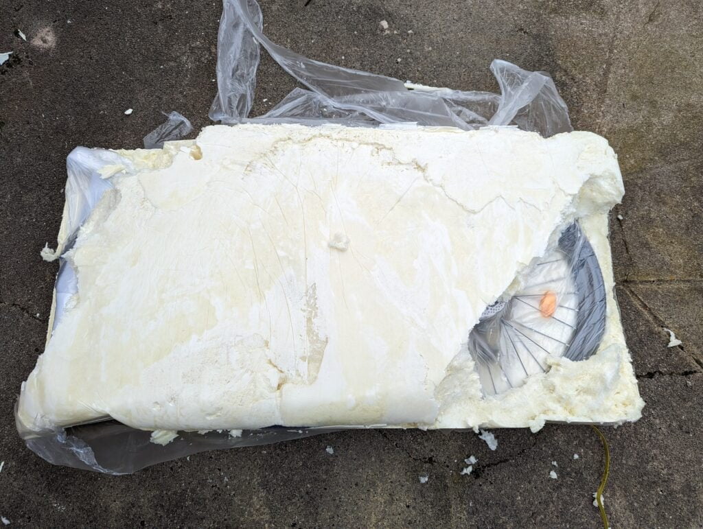 Unpacking it is incredibly messy, and you should do this outside. It is quite a soft expanding foam so easy to remove. It just breaks off easily and gets blown away easy.