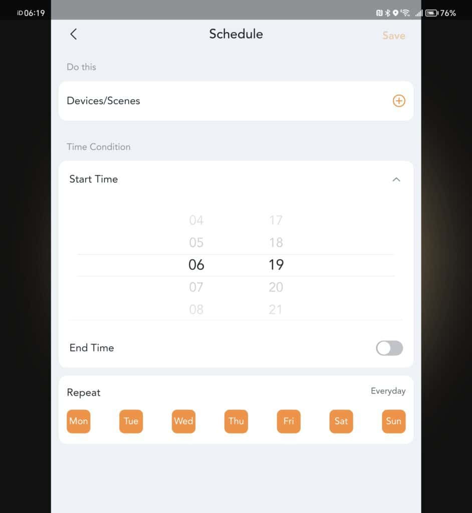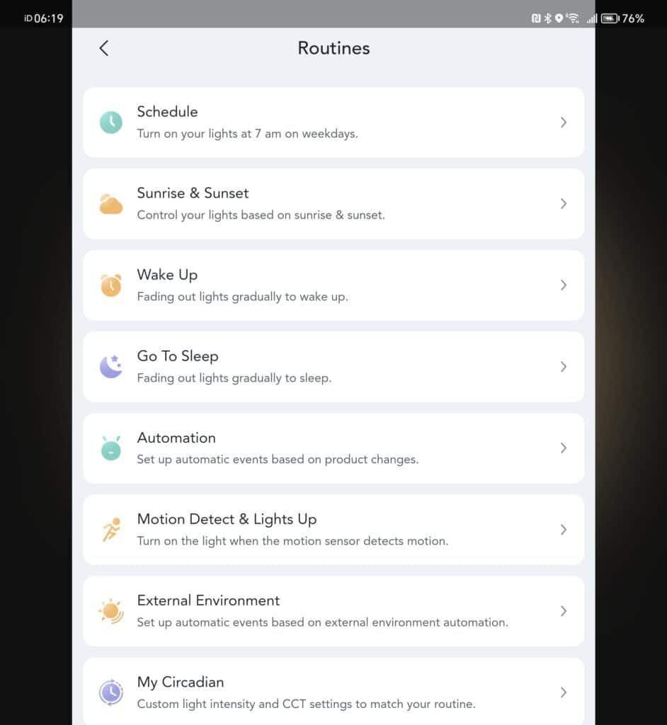 Then, within the settings section, you have access to routines, this again includes schedule, but you have many other options, including:
