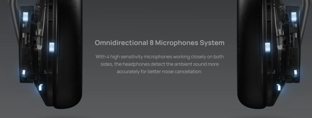 Huawei has an omnidirectional 8 microphone system, which seems to offer two outward-facing mics, one near the bottom and one inside the earcup. They claim up to 40db of ANC.
