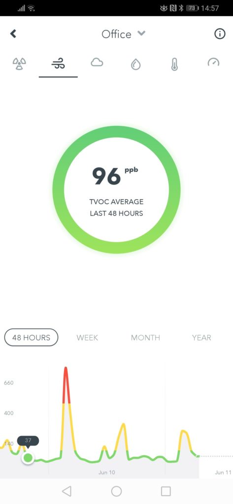 In the web client, you can see the exact times of readings, which makes it a little easier to diagnose possible causes of low air quality. We get peaks in our TVOC and CO2 levels at times that are similar to when I cook lunch or dinner. We are getting a new kitchen soon, and ventilation is one of my priorities, so this should hopefully reduce.