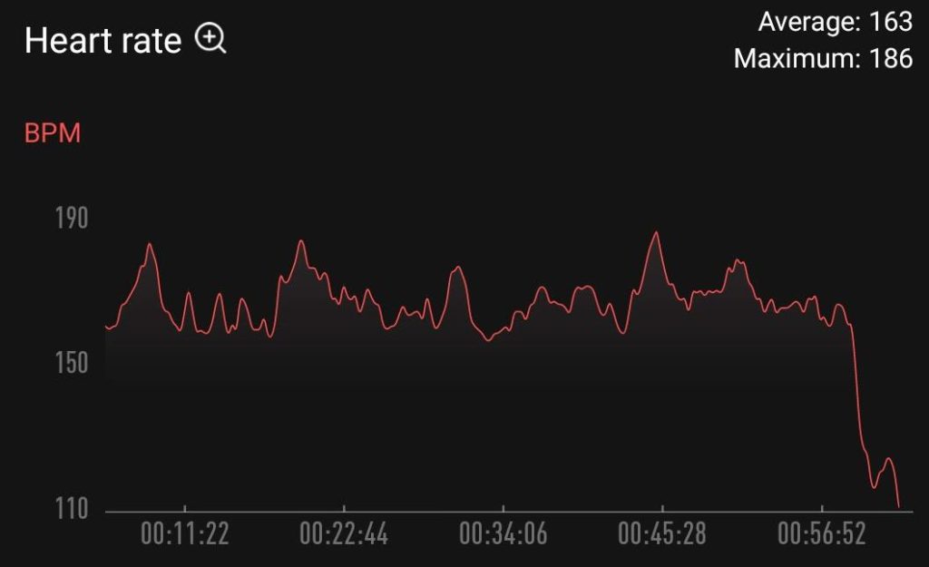 When tracking an activity cycling in Zwift, things generally didn’t go so well. This is a common problem with wrist-based HR for many watches. In a Zwift race on the Alpe du Zwift route, it had my average HR at 124 bpm and max at 169bpm. Garmin and a chest strap were 162/171bpm.