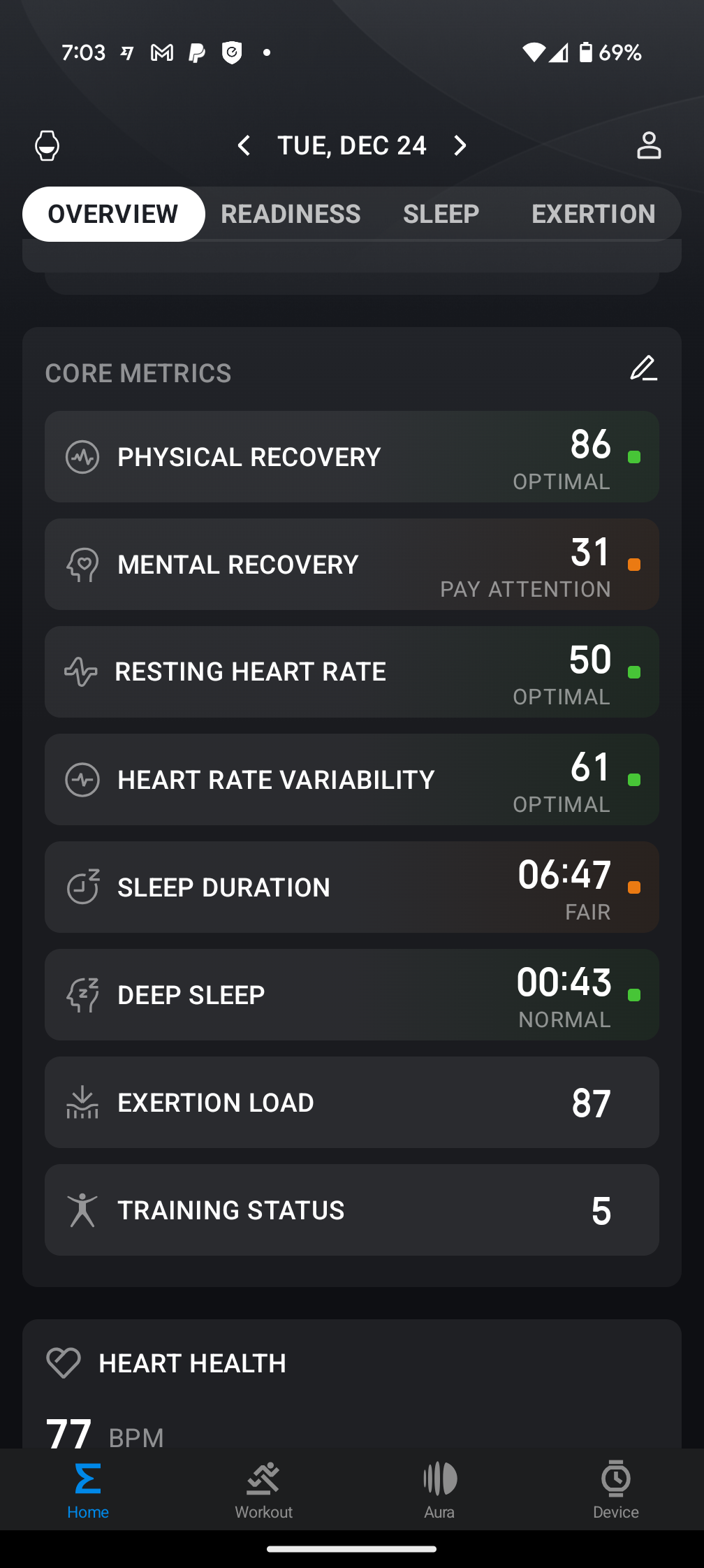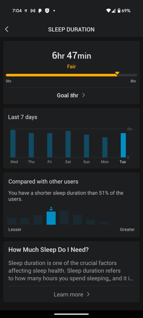 Data syncing works reliably, with activities appearing promptly after completion. The app provides detailed analytics for workouts, sleep, and health metrics, presented through clear graphs and summaries.
