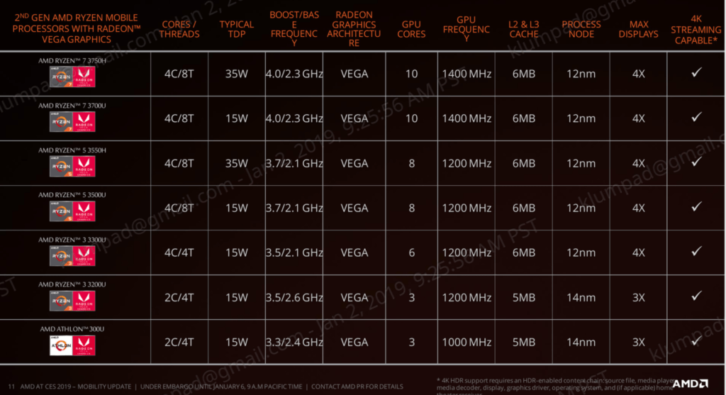 The flagship chip will be the Ryzen 7 3750H, a quad-core 35W processor with simultaneous mutli-threading, a 2.3 GHz base clock, a 4.0 GHz turbo frequency, 10 Vega compute units (640 SPs), a peak GPU frequency of 1400 MHz, and support for four displays. This is going to be aimed at the high-end and gaming notebook market, typically with devices that have discrete GPUs.