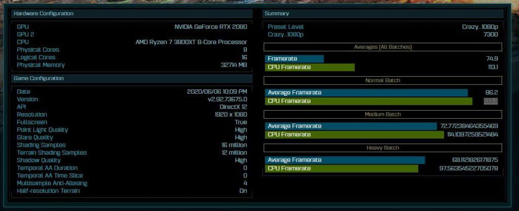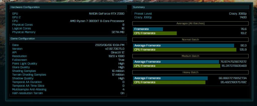 The system runs a NVIDIA RTX2080 with 32GB of RAM and uses the Crazy 1080P present manages a score of 7400 with the average framerate result of 76.6 and CPU framerate of 113.2.