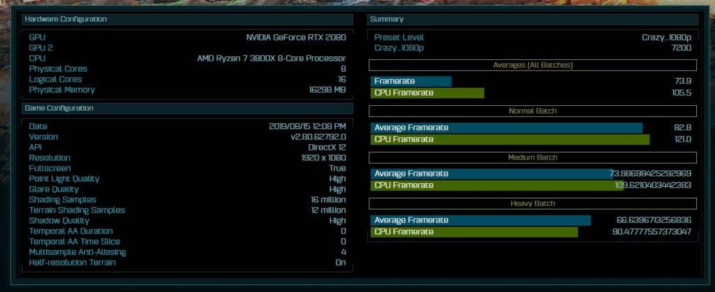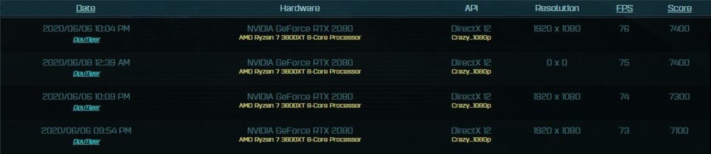 The closest computing benchmark I can find is a bit out of date from August 2018 but that has the AMD Ryzen 7 3800X with 16GB of RAM the RTX2080 using the same presents. This manages a framerate of 73.9 and CPU framerate of 105.5 with a total score of 7200.