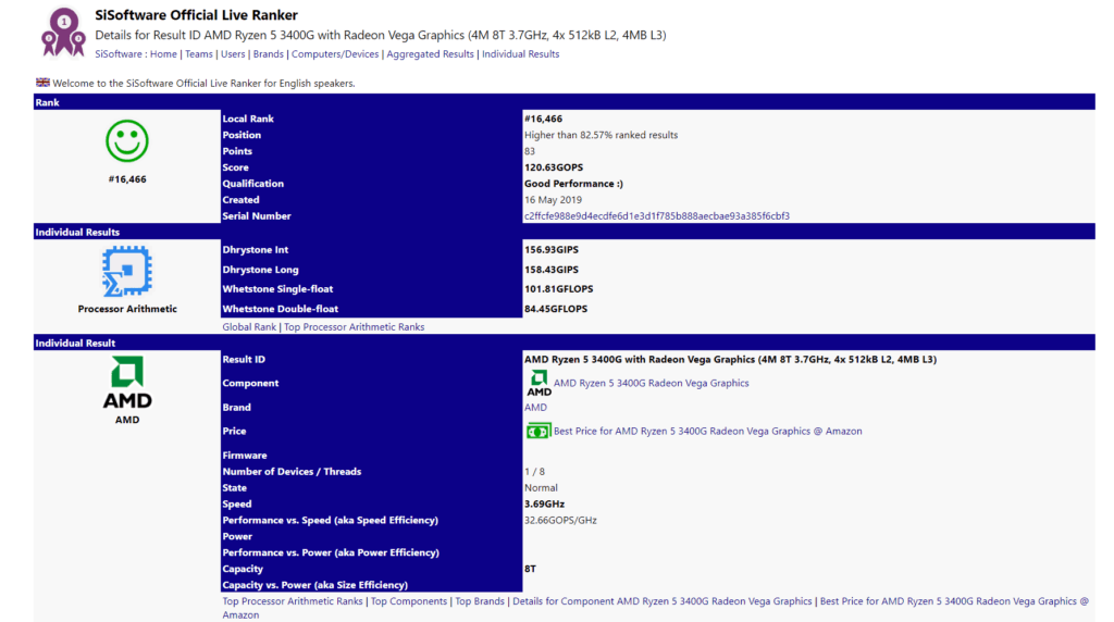 There is also an entre in SiSoftware Official Live Ranker detailing the new Ryzen 5 3400G.