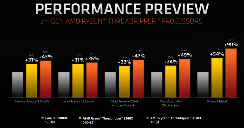 AMD was keen to point out their dominance over Intel posted benchmarks showing the performance over the 18-core/36-thread Intel Core i9-9980XE which currently costs $2,110.47 on Newegg vs $1399 and $1999 of the two new AMD chips.
