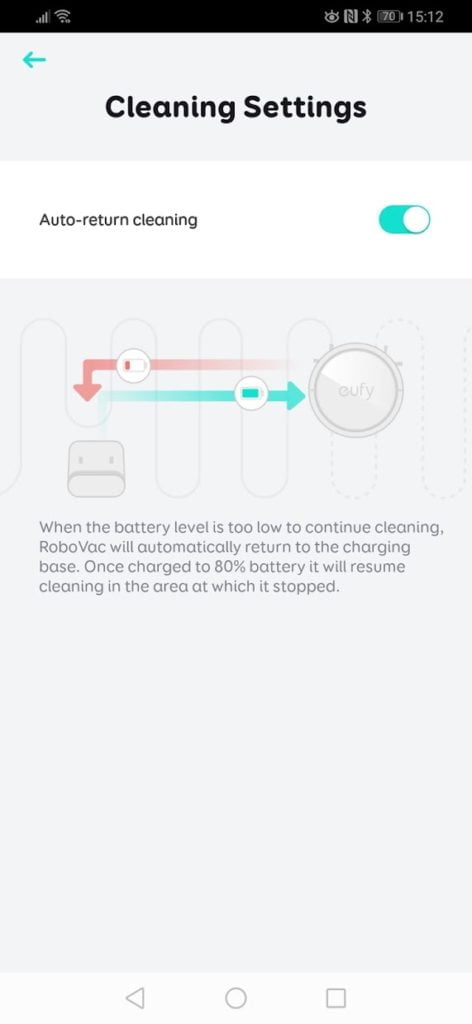 With it being a large kitchen, I enabled the auto-return cleaning, which allows the RoboVac to return to its charge station big clean, charge, then automatically go back to work.
