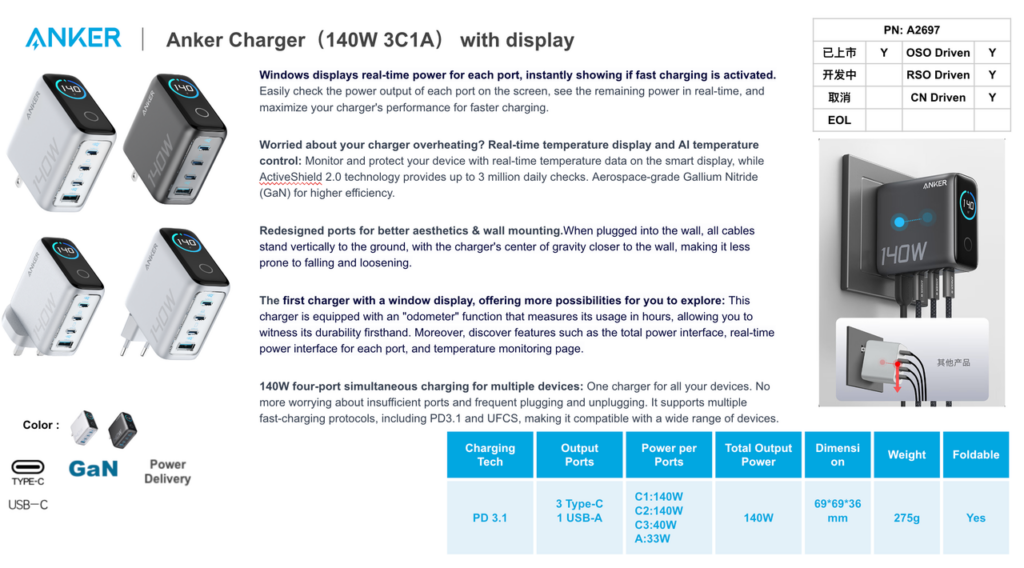 Building on their charging technology expertise, Anker has introduced a new 140W desktop charger featuring an integrated display. This charger incorporates several practical improvements, including: