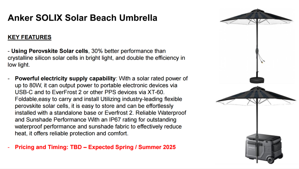 The Solar Beach Umbrella is scheduled for release in Spring/Summer 2025, with pricing to be confirmed.