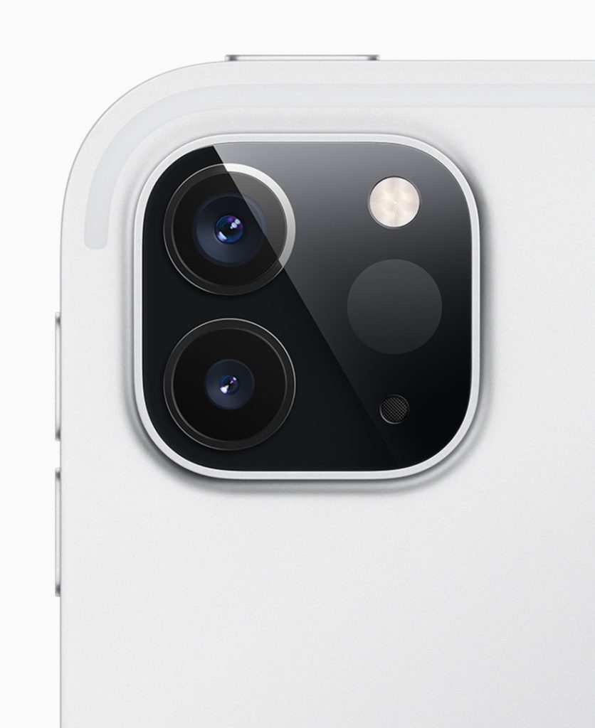 The new tablet adopts a similar-looking square camera housing from the iPhone 11. This includes a new 12 MP wide camera module, a 10 MP ultrawide camera module, a LED flash, and a 3D depth sensor that can measure the distance to surrounding objects up to 5 meters away both indoors and outdoors.