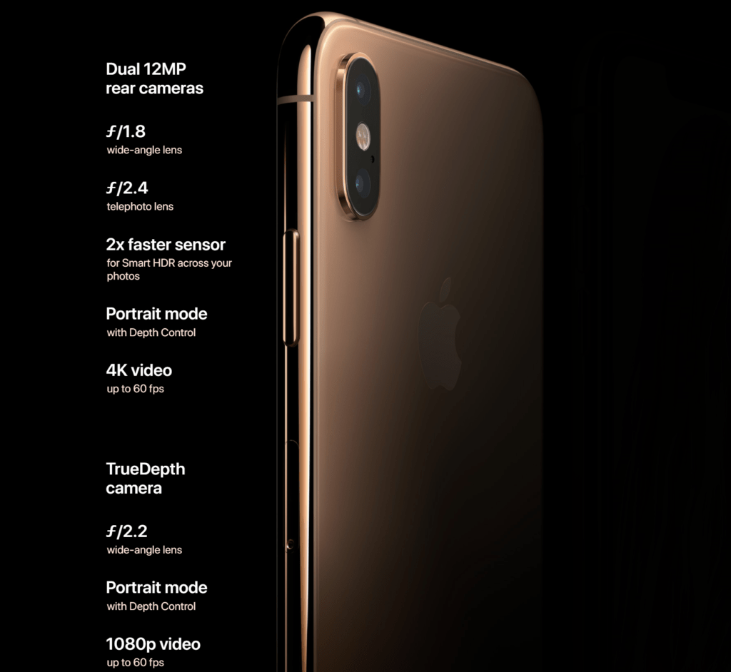 The XS models use a dual rear camera set up with 12MP sensors for each the standard (wide-angle) and telephoto lenses, with an f/1.8 and f/2.4 aperture. Apple is now using a 1.4µm pixel pitch sensor – up from 1.22 µm on the iPhone X which will give you improved light per pixel.