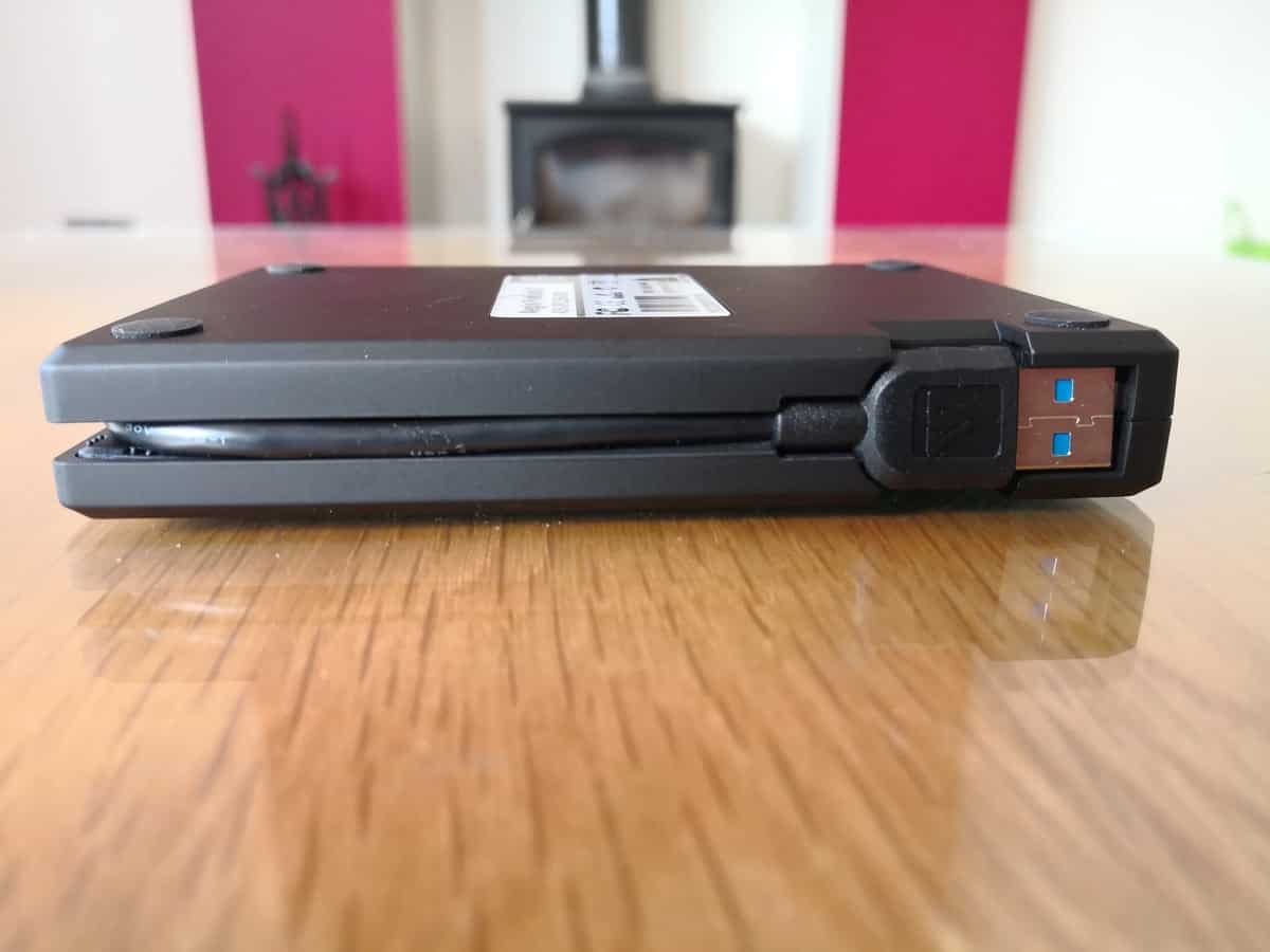 This is physically a bit larger than your typical 2.5” portable drive, which is likely due to the additional hardware and number pad. There is a built-in USB cable the clips into the side of the drive.