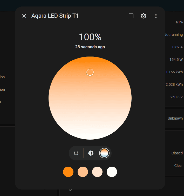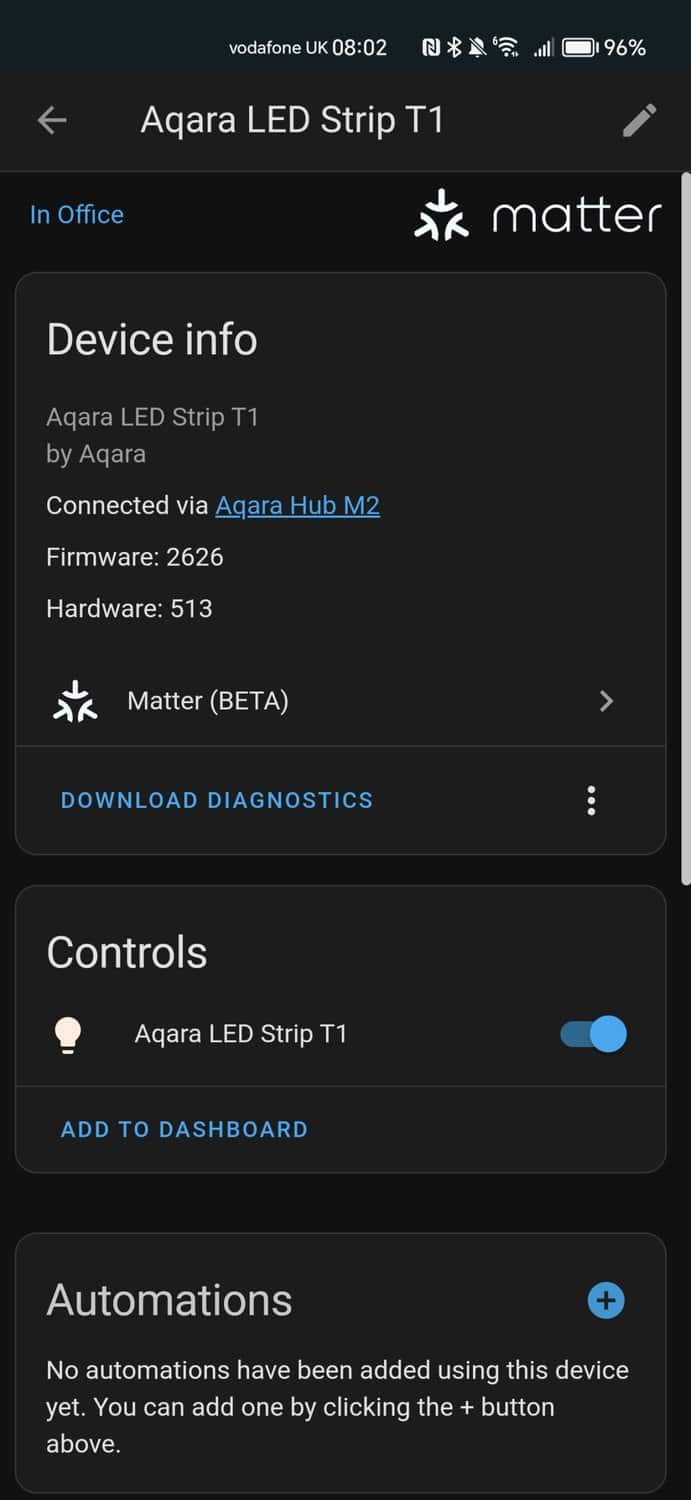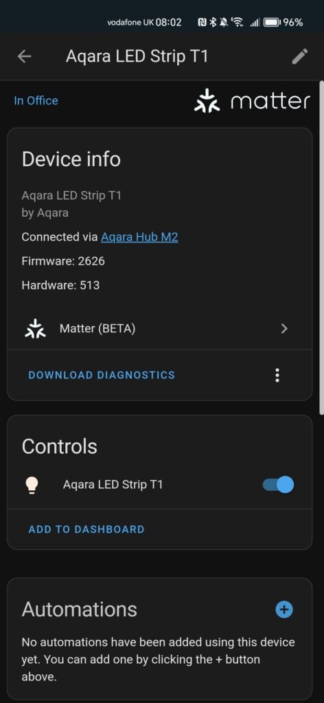 Within Home Assistant, you don’t have the wide range of settings you get in the Aqara app. This is one of the reasons why I have warmed up to Matter. If I had integrated the Strip T1 directly into Home Assistant with Zigbee, I’d have less functionality.