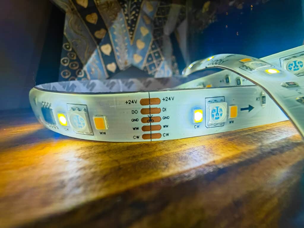 The strip contains separate LEDs for colour and whites, with CW representing the cool white LED, and WW for warm white, flanking the RGB LED.