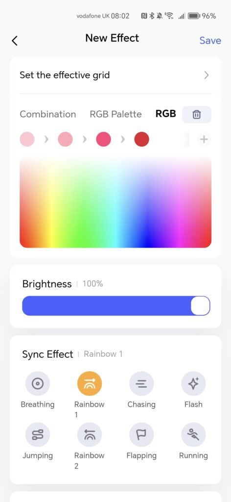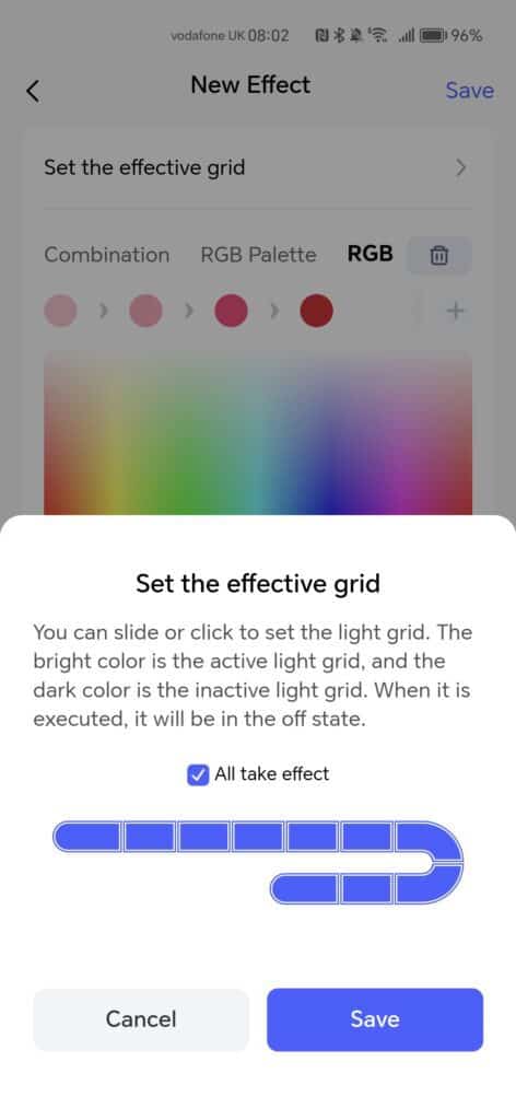 This segmented LED strip is broken down into ten segments, allowing you to assign a colour per segment. The RGB Palette is the main option for this, but you can select any predefined setting, select the copy function, and then customise it as you like.