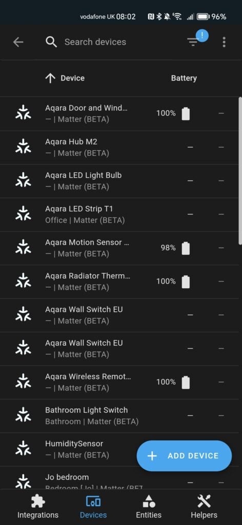 Using the Matter (Beta) option within the integrations, it is incredibly easy to integrate the Aqara M2 Hub into Home Assistant, and this then brings in all the connected devices.