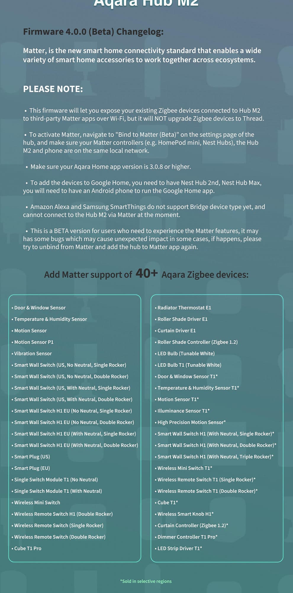 - At this stage, we have 40+ Aqara devices that are able to connect with Matter via the M2 hub (please refer to this list). And only the global versions of these devices are guaranteed to get Matter support, as the Chinese versions of some of the devices may not be supported at the moment.