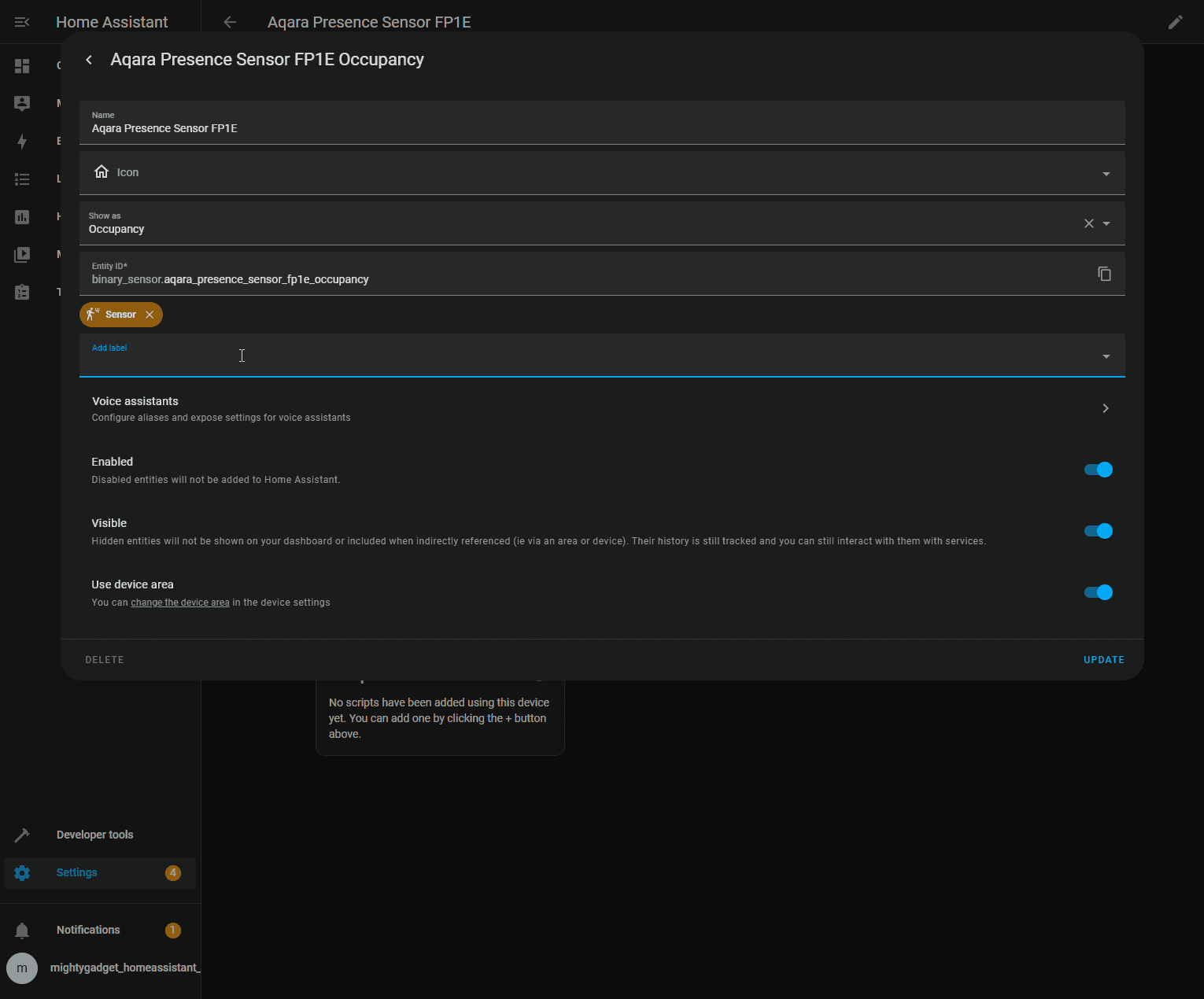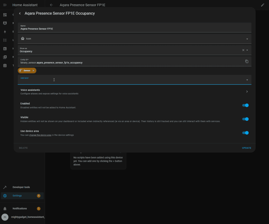 However, the functionality is somewhat limited as Home Assistant only provides automation options if the room is occupied or not occupied. There are no time-based options for the occupation or move/still detection.