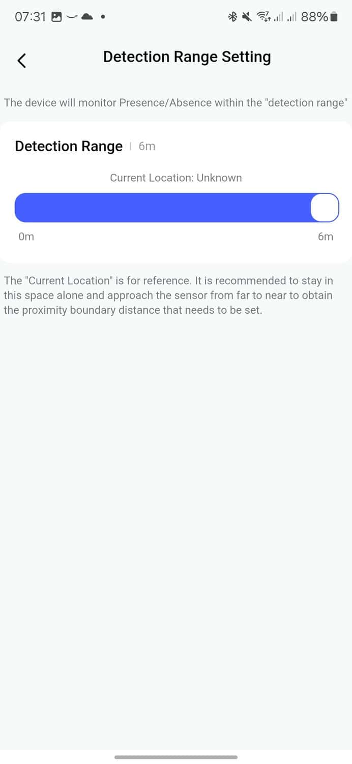 You can then define the detection range. The default is the maximum range of 6m, but this can be dialled down to 0m.
