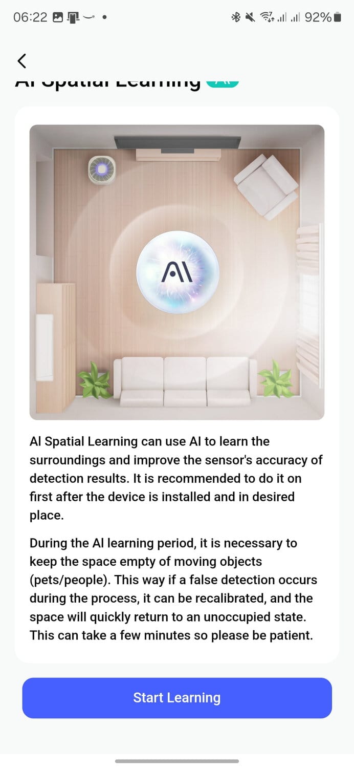 You can also use AI special learning, which allows the FP1E to learn what objects are in the room and eliminates false alarms and improves detection accuracy. When you do this, you must vacate the room and have nothing else in the room that moves.