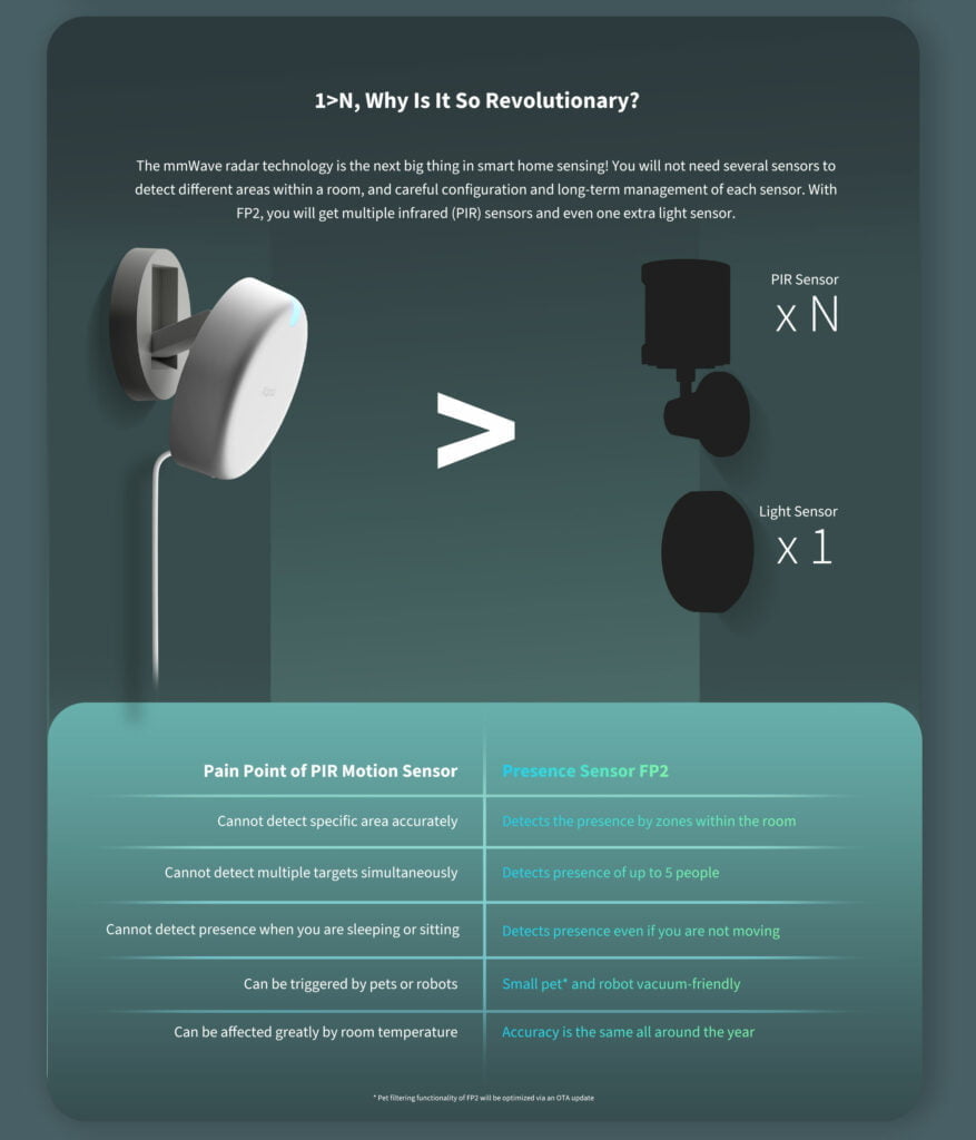 The mmWave-based FP2 Presence Sensor takes a leap forward from the PIR motion sensors as the former detects a person’s presence with even the slightest movement, such as the act of breathing.