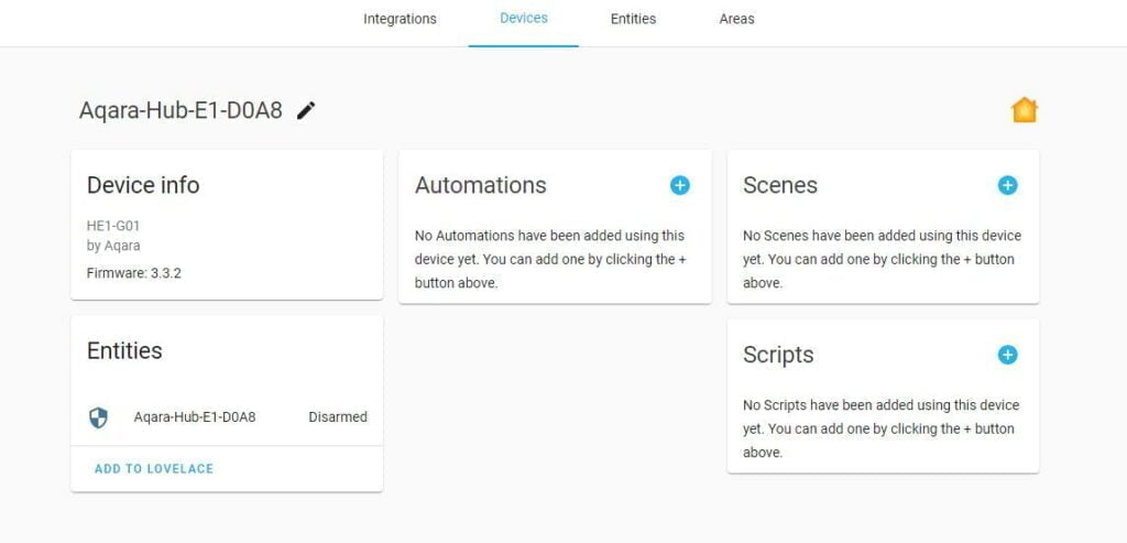 The E1 has the same set-up procedure as any other Aqara hub. Once you plug it in, you will need to select add a new device, then select the E1. It will scan the hub, and when identified, you need to provide the password for a 2.4Ghz network. With this hub, it didn’t seem to pass over the data automatically, so I had to connect to the WiFI SSID of the hub.