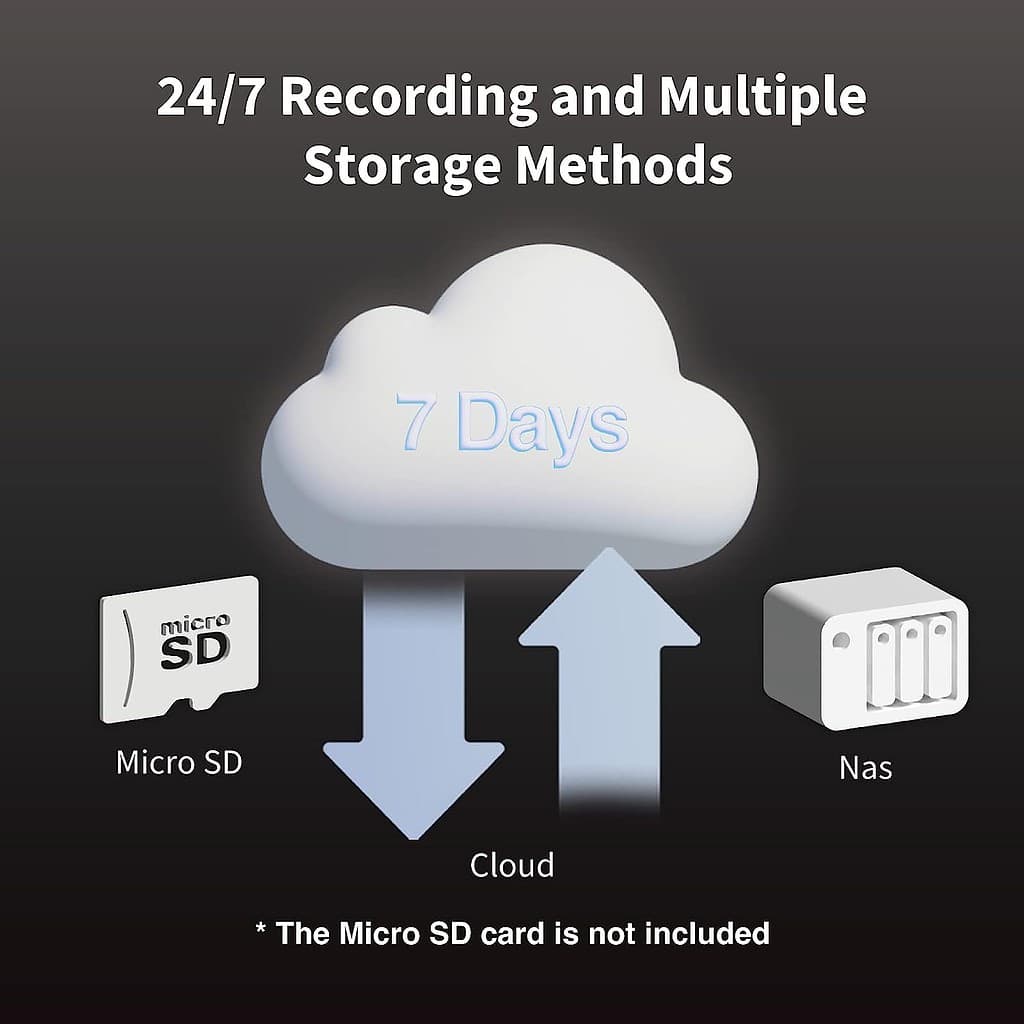 It uses local storage and 7-days free cloud storage, so there is no subscription required, unlike Arlo and Ring. Local storage is via up to 512GB microSD card on the chime repeater, so you can store 24/7 recordings locally. It should also support recording to a NAS.