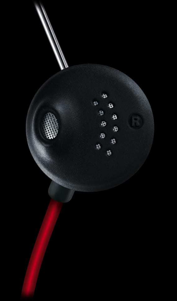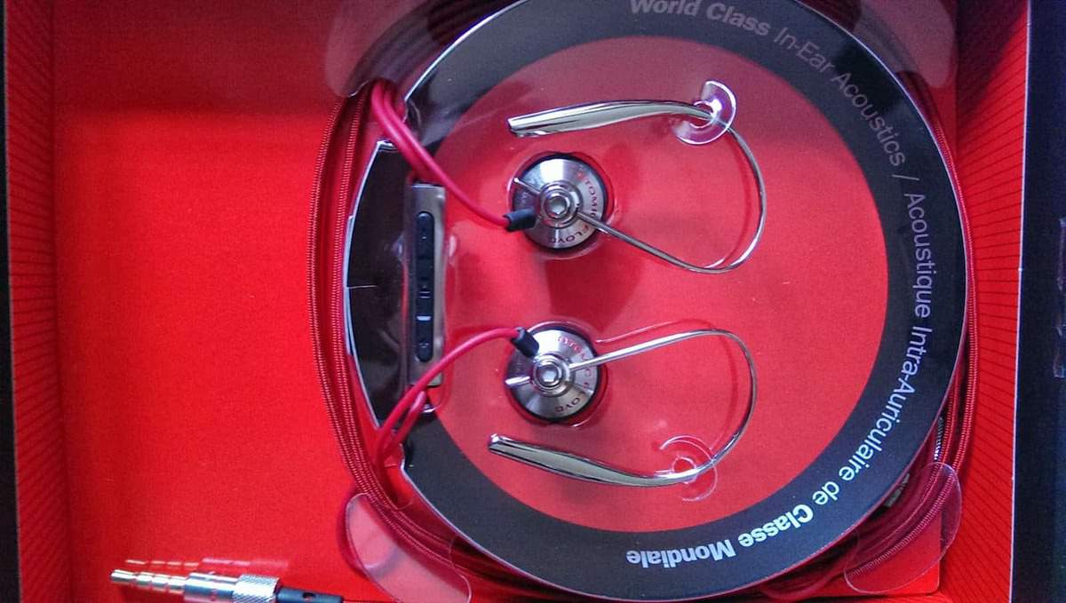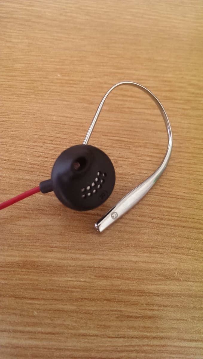 The earphones themselves are a bit different from the recent trend of going right inside your ear, these sit just on the outside of the ear canal with a small bit sticking out directing the music inside your ear. Normally this type of earphone is prone to falling out of your ear (for me at least) however they are held in place by an excellent metal wire band that fits around your ear.