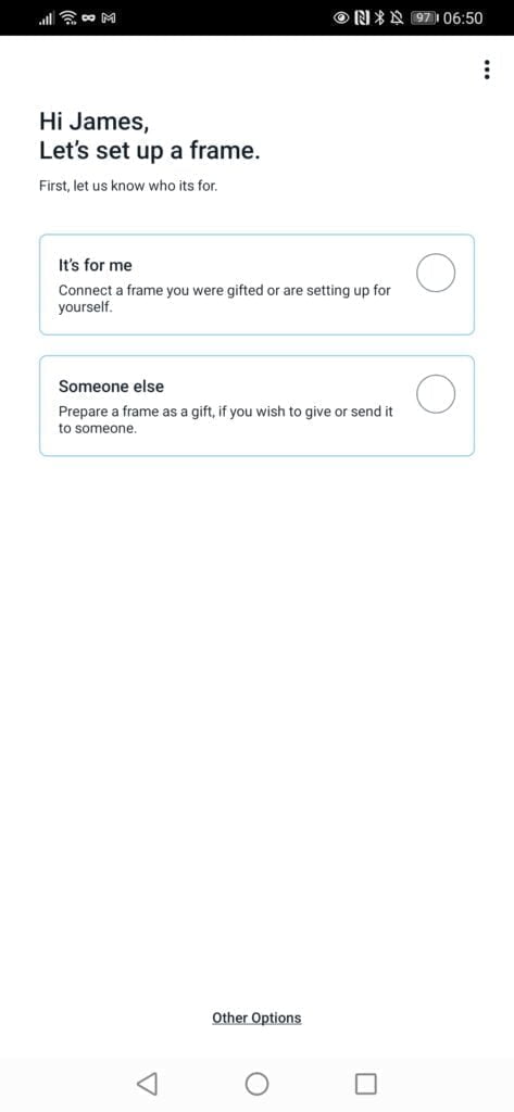With the frame powered up, you go through a typical smart device set up procedure, you need to use Bluetooth to connect to the frame, confirm the code on the display and pass over your WiFi credentials.