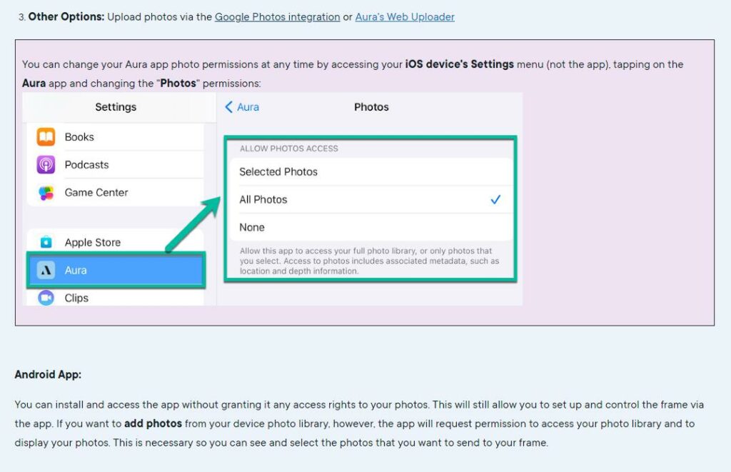 In particular, this affects Android users. Any photo you send to the frame gets uploaded to the Aura/AWS servers. Apple users seem to be able to switch this auto-upload off, but even Apple users will likely not be aware that when selecting all photos, it means the app uploads the photos rather than just reads them on-device.