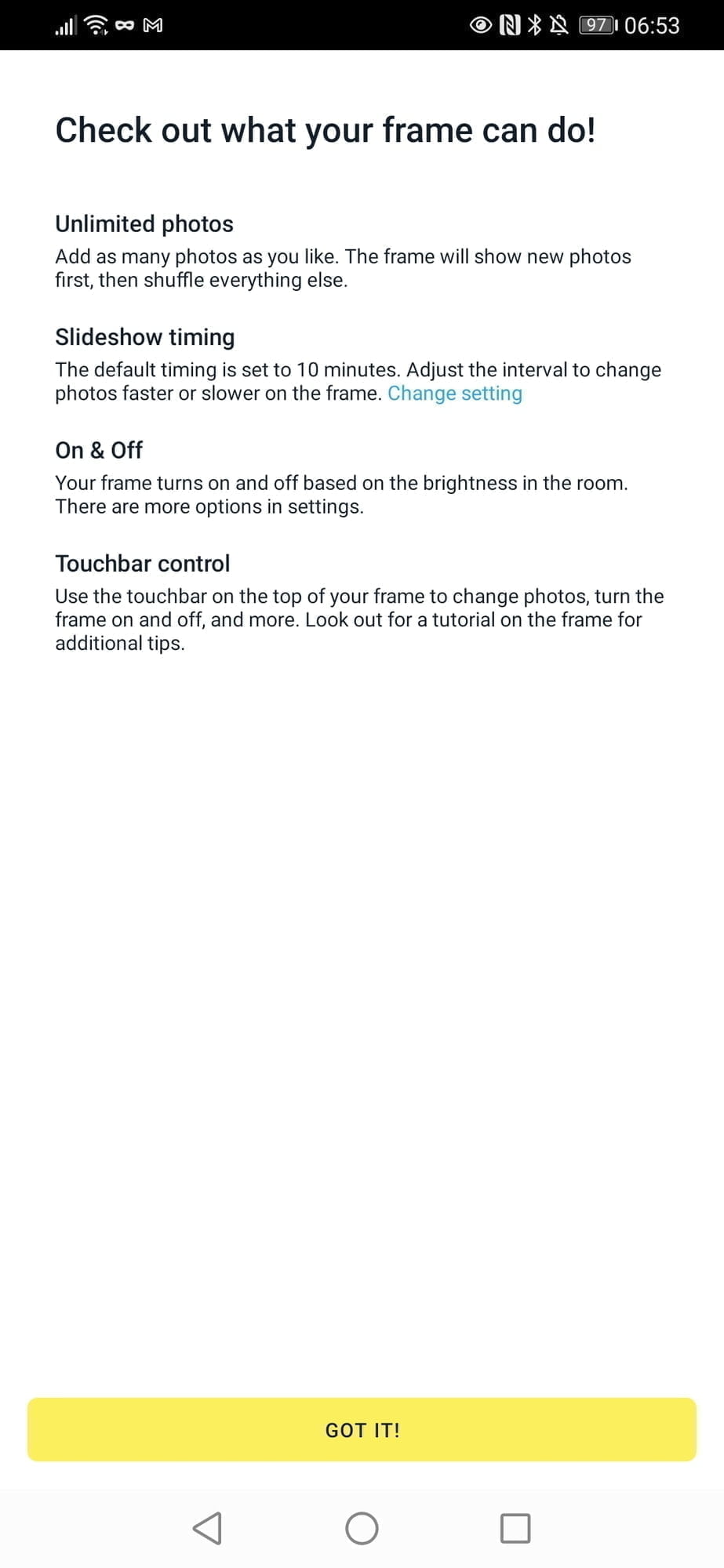 With the frame powered up, you go through a typical smart device set up procedure, you need to use Bluetooth to connect to the frame, confirm the code on the display and pass over your WiFi credentials.