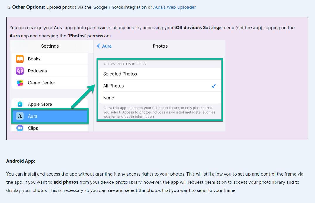 Aura doesn’t particularily make this issue clear; they have half-heartedly tried to offer some transparency by added a recommended article link on the website for Photo Access and Privacy