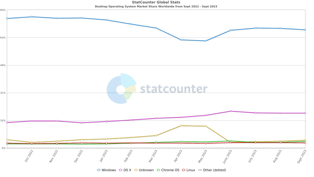 The reality is that the desktop market share for Linux is reported by StatCounter to be at 3.02% as of September 2023, lagging behind Chrome OS with 3.89%.