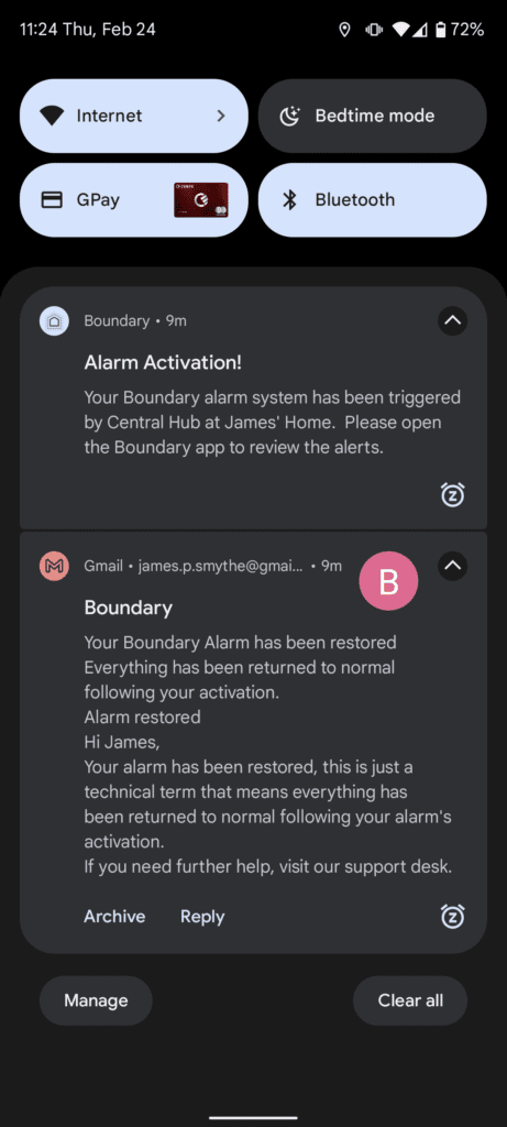 Once set up, the system works well, and I have experienced no problems with it at all. Because I work from home, I have never really bothered with an alarm system, and I never remember to arm them when I review them. Boundary has a useful geofencing feature that will notify you to arm the system when you leave your home. The notification doesn’t come through very quickly. When I go out for a walk, it’s normally at least 5 minutes after I leave the house, which is fine by me, the important thing is that it has been reliable.
