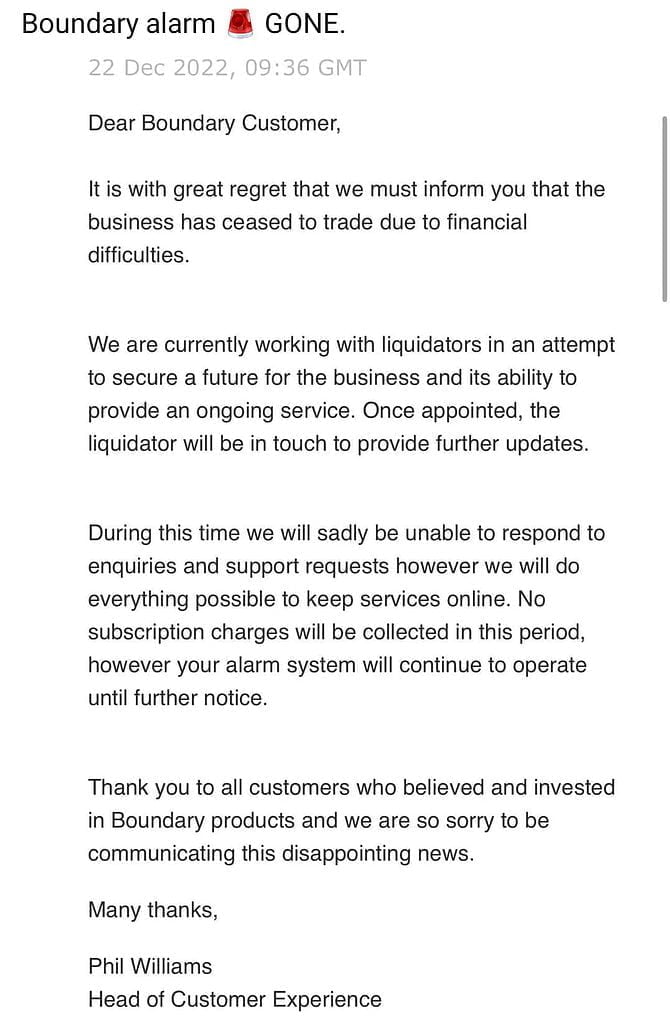 This information is backed up by a screenshot of an email or app notification from Boundary confirming this information. They have stated that they are working with liquidators in an attempt to secure a future for the business.