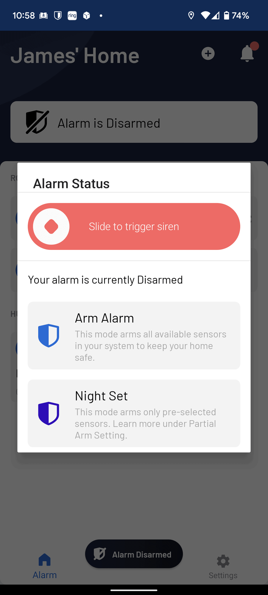 You can arm things the old fashioned way, with your PIN code on the keypad, but I have predominantly used the mobile app, which gives you the option to fully arm it or put it in night mode.