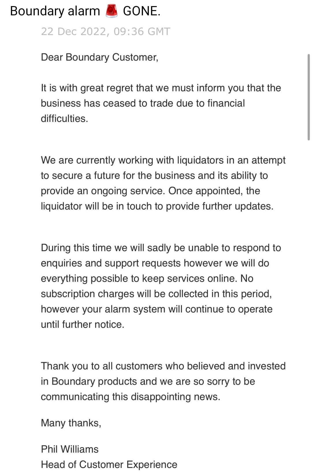 This information is backed up by a screenshot of an email or app notification from Boundary confirming this information. They have stated that they are working with liquidators in an attempt to secure a future for the business.